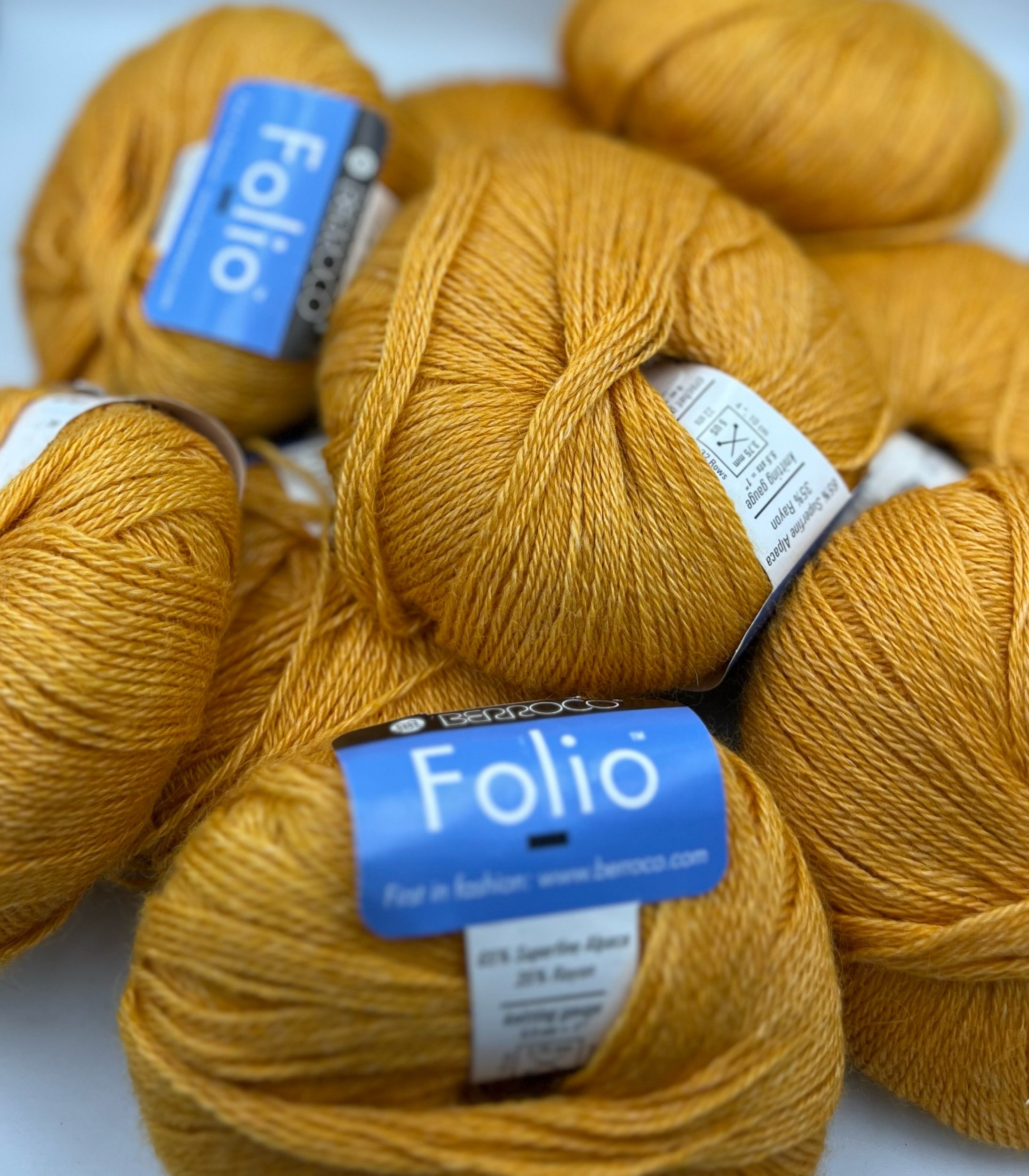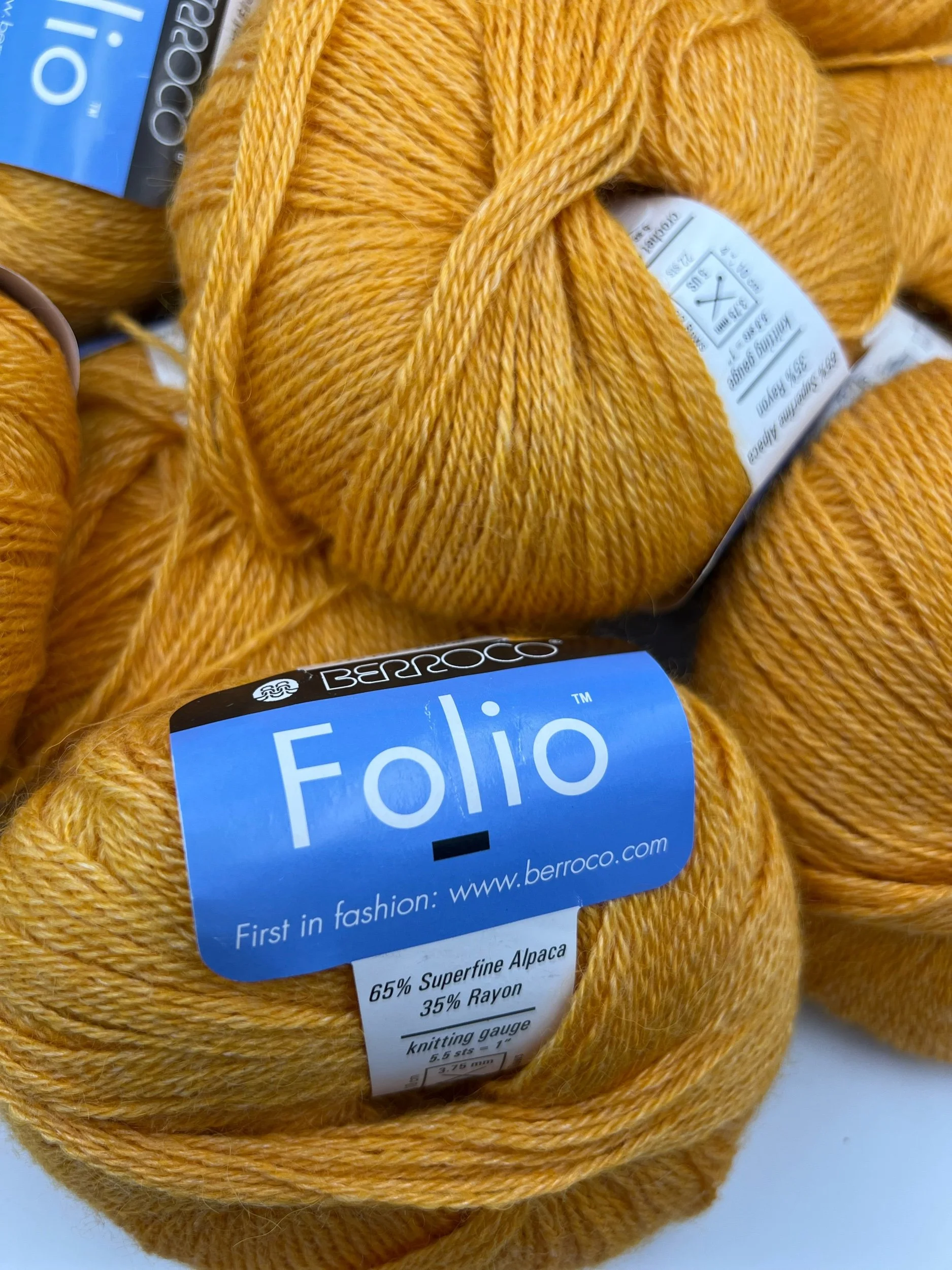 Shop › Berroco Folio Image 1 of 3 Image 2 of 3 Image 3 of 3 Berroco Folio Sale Price: $8.00 Original Price: $17.00 65% Superfine Alpaca/ 35% Rayon219 yards/ 1.75oz/ 50gRecommended needle size US 5 Quantity: Add To Cart Added! 65% Superfine Alpaca/ 35% Rayon219 yards/ 1.75oz/ 50gRecommended needle size US 5